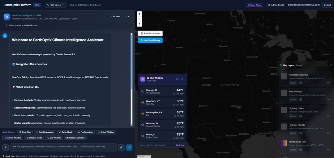 Continuously ingests and harmonizes live feeds from GOES-R satellites, NEXRAD radar network, NASA EONET disasters, NOAA GFS forecasts, and OpenWeather—built on AWS‑native, event‑driven pipelines for sub-minute awareness across 5 production data streams.